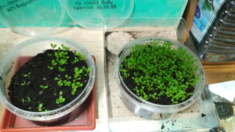 Jakmile kotyledon vyjde, můžete otevřít víko a sledovat vlhkost půdy. Z tohoto důvodu je lepší zasadit do průhledných lilků. Podle barvy půdy, na řezu lilku, můžete vidět, jak a jak hluboko půda vysychá. Buď je tmavě nebo světle hnědá. To lze pochopit pozorováním při přípravě země na zhutnění. A žádné přistání do sněhu, prohloubení 5 mm. obilí a jiné odpadky nejsou potřeba. Stačí posypat zrnky navrch!