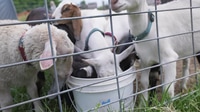 Malé stádo mladých koz a jehňat na farmě pije z kbelíku na pastvině.