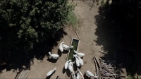 Bílé saanenské mléčné kozy pijící z vodního koryta – dynamický pohled z ptačí perspektivy