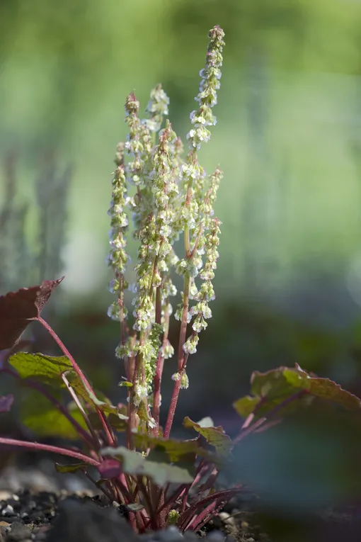 Jak se otepluje, rostlina vyroste vysoký květní stonek, ale je nejlepší ho odstranit, abyste podpořili růst listů pro lepší sklizeň. Červené květy jsou spíše nevýrazné, pletené klasy podobné rebarboře.